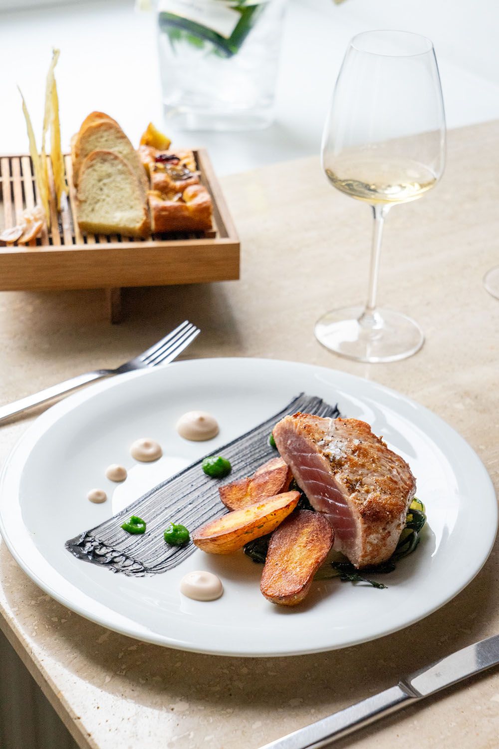Das Herzstück der Karte ist täglich frisch gefangener Fisch aus nachhaltigem Angelfang („amo“). Je nachdem, was die italienischen Lieferant:innen morgens aus dem Netz ziehen, landen Wolfsbarsch, Dorade oder Drachenkopf auf den Tellern. Die Zubereitung bleibt dabei klassisch italienisch – ob in der Salzkruste, „all’acqua pazza“ oder auf livornesische Art. Ziel ist es, den Eigengeschmack der hochwertigen Zutaten mit handwerklicher Präzision hervorzuheben.